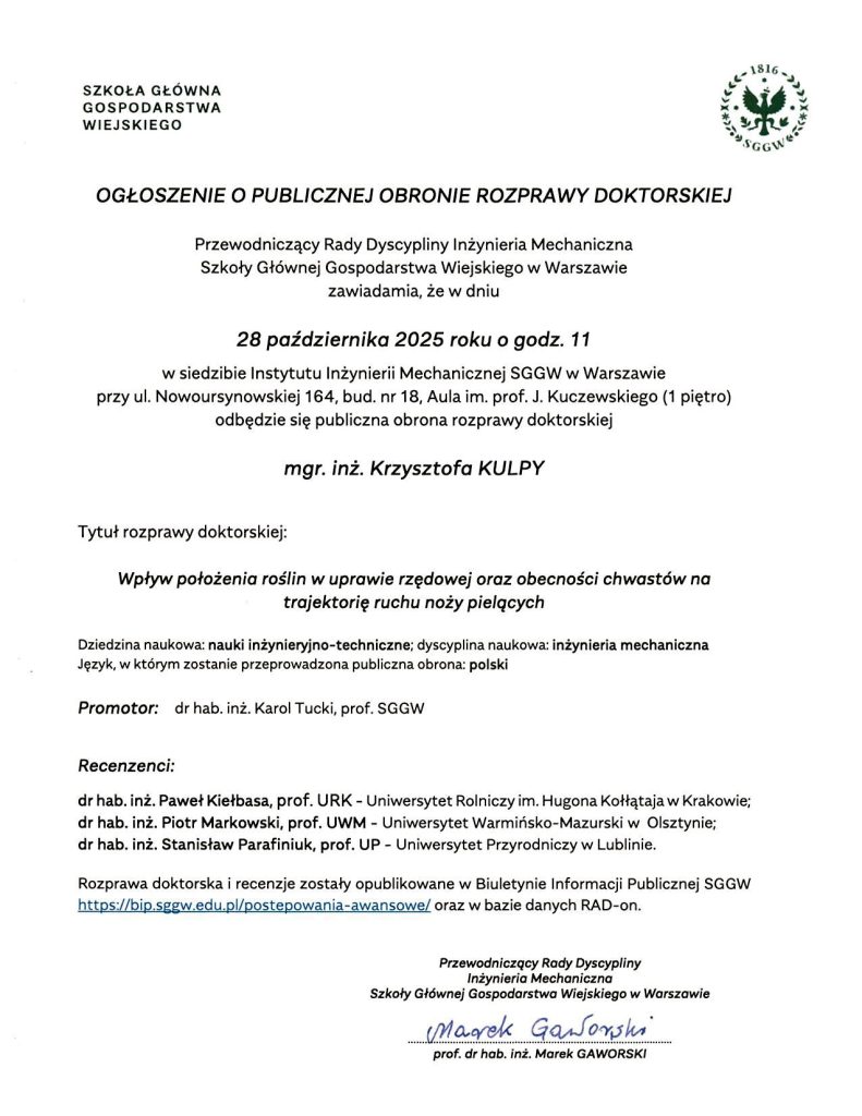 SGGW Witryn / Home / Aktualności / Postępowanie w sprawie nadania stopnia doktora – mgr inż. Krzysztofowi Kulpie