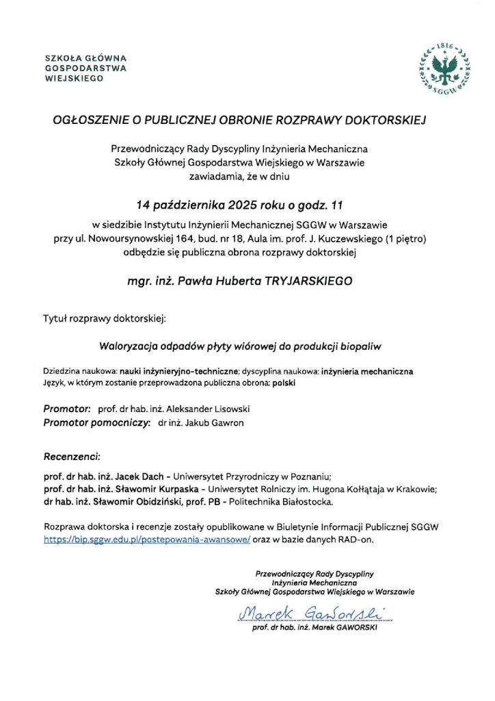 SGGW Witryn / Home / Aktualności / Postępowanie w sprawie nadania stopnia doktora – mgr inż. Pawłowi Tryjarskiemu